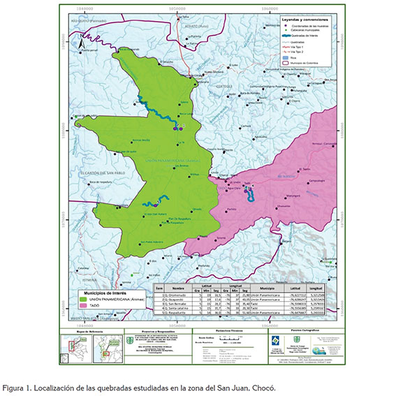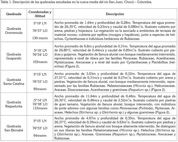 Área de estudio. La zona de estudio, se encuentra localizada en los municipios de Tadó y Unión Panamericana, ubicados en la cuenca media del río San Juan, en el departamento del Chocó, Colombia (Figura 1 y 2). Esta cuenca, se ubica entre los 5°16'N y 76°73'O, presenta una temperatura de entre los 27 y 29°C y una precipitación anual promedio, que oscila entre los 6.800 y 7.600mm, a una altura de 75msnm y pertenece a la zona de vida de Bosque Pluvial Tropical (bp-T) (Holdridge, 1996). En la tabla 1, se describen las características de las cinco quebradas seleccionadas en la zona de estudio.