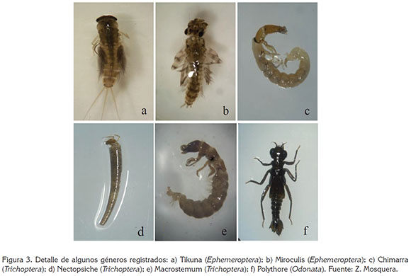 A nivel de órdenes, Ephemeroptera fue el más representativo, tanto en términos de abundancia, con 1.407 organismos (34,32%), como de riqueza específica (13 géneros), seguido de Trichoptera, con 1.026 organismos (25,02%) y Odonata, con 745 (18,17%) y, en menor proporción, se registra Lepidoptera, con 2 organismos (0,05%) (Tabla 2).