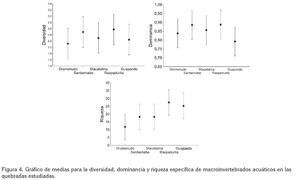 Los resultados de los índices ecológicos fueron homogéneos entre quebradas, como lo demuestra el Análisis de Varianza, con p>0,05, en todos los casos (Figura 4). El índice de diversidad Shannon-Weaver (H') presentó su máximo valor en la quebrada San Bernabé, con rangos entre 3,14 y 2,52bits/ind. La dominancia de Simpson presentó rangos entre 0,94 y 0,80, entre tanto, la riqueza específica fue mayor en Raspadurita, con un rango de entre 29 y 46 géneros.