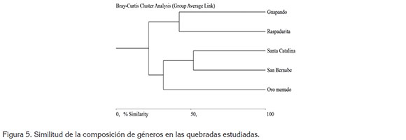 Al analizar la similaridad entre quebradas, se observa la formación de dos grupos bien definidos (Figura 5), un primer grupo formado por las quebradas Guapandó y Raspadurita y otro por Santa Catalina, San Bernabé y Oromenudo, con la más alta similaridad, observada entre las quebradas San Bernabé y Santa Catalina, con un 51,84%, mientras que las más disimiles son Oromenudo y Raspadurita, con un 21,92% (Figura 5).
