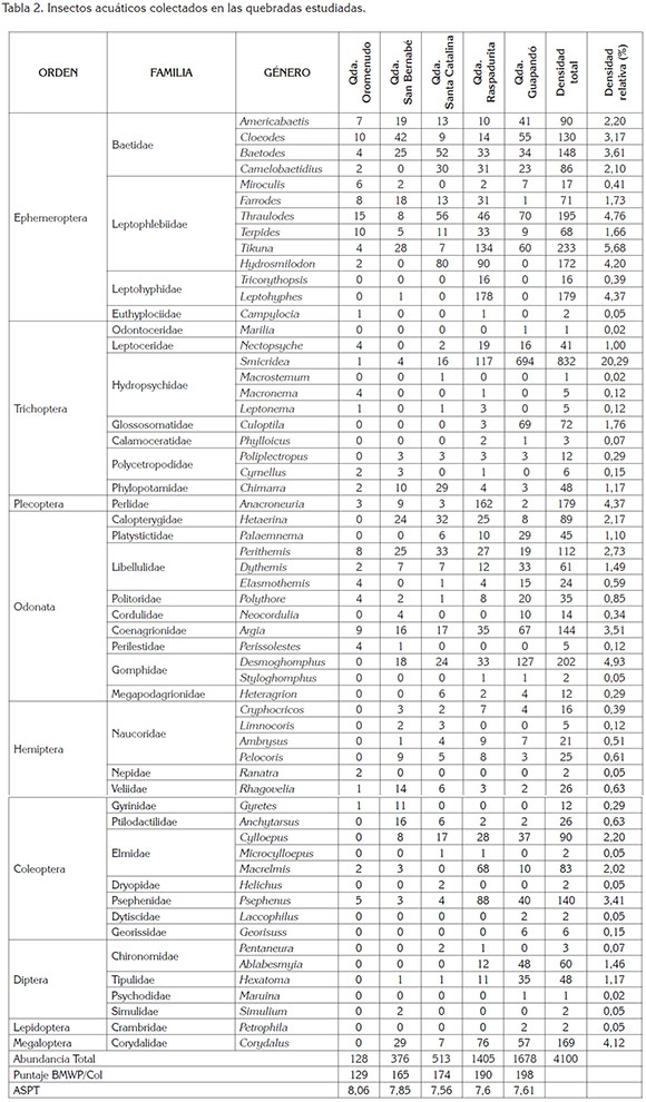 Calidad de agua de las quebradas: La calidad del agua de las cinco quebradas, se evaluó con el índice BMWP'/Col (Roldán, 2003), encontrándose que los valores oscilaron entre 129, para la quebrada Oromenudo y 198, para Guapandó (Tabla 2), indicando que en los ecosistemas estudiados las aguas son muy limpias, con calidad buena o no alteradas, de manera sensible, a aguas de calidad excelente (valores entre 101-150 a >150), de acuerdo con la escala publicada por Roldán (2003). Por otro lado, de acuerdo con el ASPT, casi todas las quebradas tienen agua Clase II, aceptable (ligeramente contaminada); sin embargo, la quebrada Oromenudo presentó aguas Clase I, buena (aguas no contaminadas) (Tabla 2).