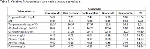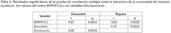 En cuanto a las variables fisicoquímicas, los promedios de cada quebrada se muestran en la tabla 3. Se encontró que en promedio la concentración de oxígeno disuelto, el pH, la temperatura, la alcalinidad y la conductividad eléctrica registraron sus mayores valores en la quebrada Santa Catalina. El menor promedio de oxígeno y de conductividad, se registra en Oromenudo, mientras que en Raspadurita, se consignan los valores más bajos de pH, de temperatura y de alcalinidad. En el caso de los nutrientes, tienden a ser mayores en Raspadurita (Nitritos y Nitratos), Guapando (Amonio) y Santa Catalina (Fosfatos). De acuerdo al análisis de correlación múltiple, se observó que el índice BMWP/Col, se encuentra correlacionado, positivamente, con la diversidad y la riqueza de insectos acuáticos; en tanto que, en cuanto a la estructura, los índices de diversidad, de riqueza y de dominancia mostraron correlaciones positivase entre ellos (Tabla 4).