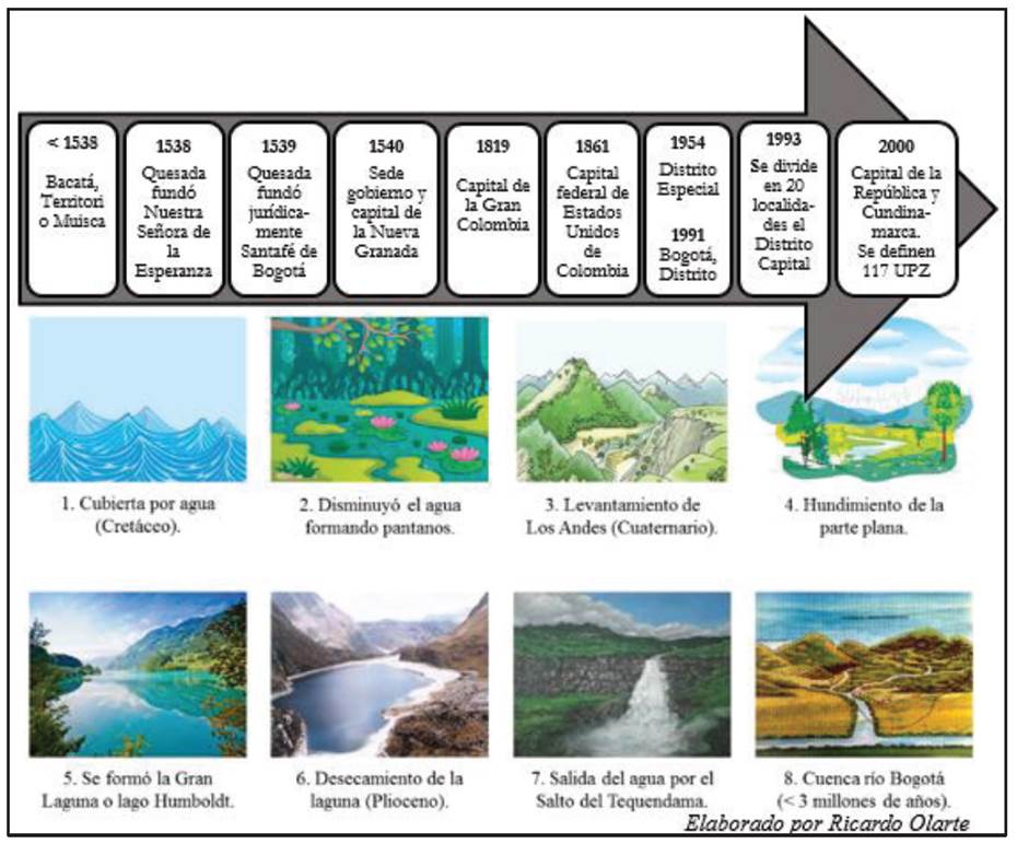 Según Peña (1991), la principal cuenca de Cundinamarca es la del río Bogotá, que nace en el páramo de Guachaneque (municipio de Villapinzón) y desemboca en el río Magdalena (municipio de Girardot). Bogotá tiene la mayor densidad urbana del territorio colombiano, 16,47hab/km2; asimismo, es la principal abastecedora de servicios comerciales y de salud y, además, concentrar servicios especializados, como financieros, de educación superior y administrativos, lo que implica un flujo amplio de energía, que transita en este sistema (DANE, 2012). En la figura 1, se esquematiza un contraste para mostrar el paso a paso en que Bogotá, a lo largo del tiempo, se ha posicionado como el centro de poder del país y se puede ver el contraste, con el proceso de formación paulatina, de la cuenca que alberga a la ciudad.