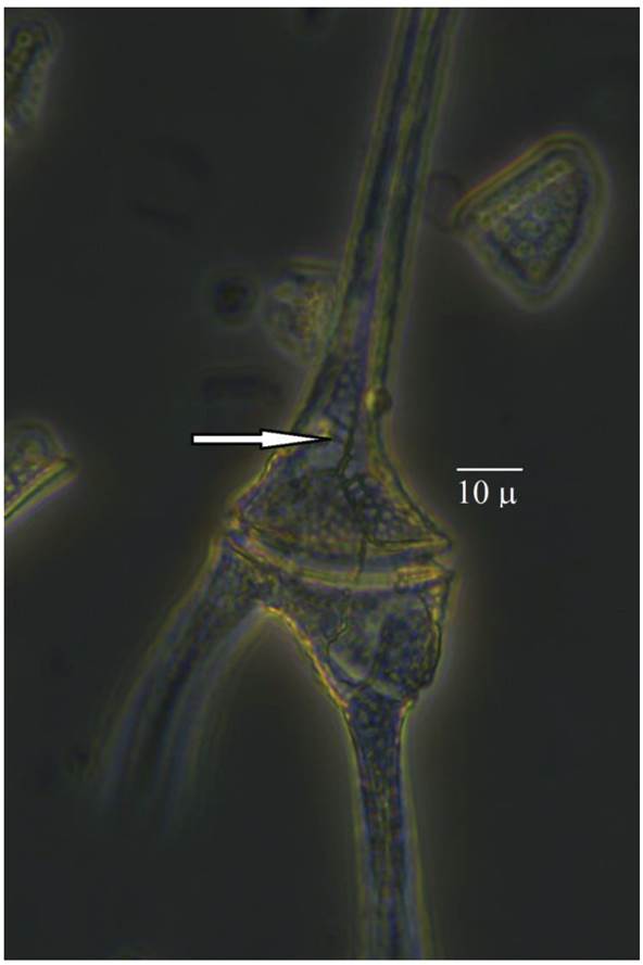 C. hirundinella y C. furcoides son especies similares, en cuanto a su contorno y tamaño y se pueden confundir entre sí. Una manera de distinguirlos es por la longitud de la placa 4’; mientras que en C. furcoides es muy corta y alcanza aproximadamente un tercio del cuerno apical, en C. hirundinella es mucho más larga y alcanza el ápice de la célula (Calado & Larsen, 1997). En este estudio, los especímenes examinados tenían una placa 4’ corta, que corresponde a C. furcoides (Figura 1).