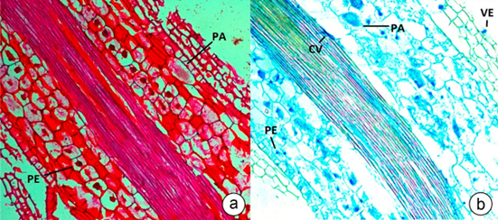 Figura 2 Colonización de micorrizas en vista de corte longitudinal. a) Tinción de safranina y b) tinción de lactofenol. PA: pelotón activo; PE: pelotón degradado; VE: estructura en el velamen; CV: penetración en el cilindro vascular.