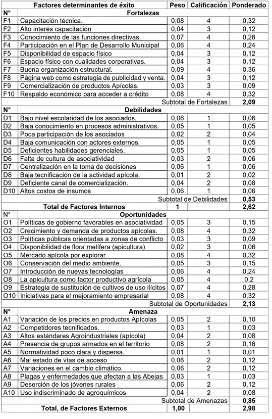 Recolección de datos: Con el desarrollo de dos talleres participativos con los 22 asociados y la aplicación del cuestionario, se logró obtener información relevante, para la construcción de la matriz DOFA, permitiendo la formulación de la matriz MEFI, donde se evaluaron las fortalezas y las debilidades más relevantes de la Asociación de Apicultores “Panaldemiel”, dando como resultado 2,62 % (Tabla 1); los factores internos ponderados son superiores a 2,5 %, indicando que la posición interna de la asociación es fuerte, que puede contrarrestar los efectos de las debilidades y, a su vez, generar alternativas de desarrollo, aprovechando eficientemente cada uno de los recursos.