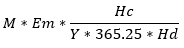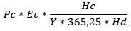 Donde, Pc = número de participantes (computadores); Ec = emisiones de los computadores (kgCO2eq/computador); Hc = duración de la conferencia en horas; Y = años de vida útil de los computadores; Hd = horas diarias de uso de los computadores (hora/día). En este Congreso, Pc = 269; Ec = 342 (se obtuvo del promedio de las emisiones del ciclo de vida de los computadores); Hc = 52,5 horas; Y = 4,7 años; Hd = 10,5 horas, suponiendo que participaron de todas las actividades diarias del Congreso. La constante 365,25 corresponde al número de días del año.