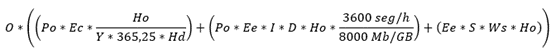 Donde, O = número de reuniones de los organizadores; Po = número de participantes en las reuniones de los organizadores; Ec = emisiones de los computadores (kgCO2eq/computador); Ho = duración de las reuniones de los organizadores (horas); Y = años de vida útil de los computadores; Hd = horas diarias de uso de los computadores (horas/día); Ee = emisiones de la electricidad (kgCO2eq/kWh); I = 0,64 kWh/GB, con base en Jensen (2019); D = tasa de trasferencia de datos (Mbps); S = número de servidores; Ws = tasa de energía de los servidores (kW/servidor), artículo base. En este Congreso, O = 21 reuniones; Po = 109 participantes; Ec = 342, se obtuvo del promedio de las emisiones del ciclo de vida de los computadores; Ho = 10,5 horas; Y = 4,7 años; Hd = 8 horas; Ee = 0,166 kgCO2eq/kWh, obtenido de la Resolución No. 000385 de 2020 - Actualización del Factor Marginal de Emisión de Gases de Efecto (UPME, 2020); I = 0,64 kWh/GB, con base en Jensen (2019); D = 5,5 Mbps/computador (Zoom, 2021); S = 1 servidor; Ws = 0,594 kW, tasa de energía de los servidores (kW/servidor).