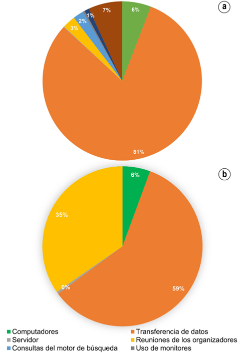 En el caso del 5° Congreso Nacional y 1° Internacional de Ciencias Ambientales “Las Ciencias Ambientales en el Antropoceno”, incluyendo los seminarios Web precongreso y las actividades propias del Congreso, se estimó un total de 4,8 tCO2eq emitidas (Figura 1). En ambos casos, el mayor porcentaje de emisiones se debió a la transferencia de datos en la red, 81 %, en el Congreso y 59 %, en los seminarios Web precongreso (Figura 1), lo que coincide con Burtscher et al. (2020), Faber (2021) y Jäckle (2021), para quienes la mayor contribución a las emisiones fue de la transferencia de datos y la energía para el uso de equipos/dispositivos de los participantes. Este trabajo siguió la metodología propuesta por Faber (2021), quien estimó las emisiones para la primera conferencia virtual de la comunidad de redes de eliminación de carbono de AirMiners. Esta fue una conferencia de 6 horas, con la participación de 207 personas, que emitió 1,3 tCO2eq, incluso, muy por encima de las emisiones estimadas para los cinco seminarios Web precongreso, de este trabajo (220 kgCO2eq) que, en conjunto, duraron seis horas y contaron con poco más de 200 participantes.