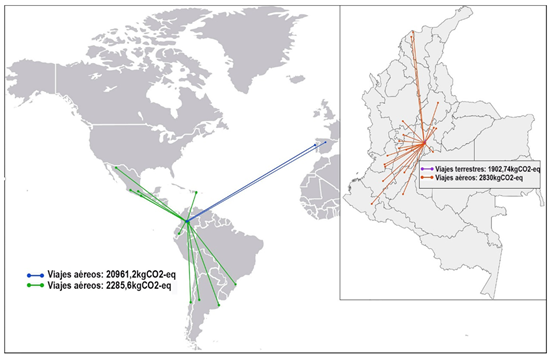 Las actividades académicas, como los congresos, son muy importantes para la investigación y el desarrollo, pues son espacios en donde los profesionales intercambian sus hallazgos y experiencias (Leochico et al. 2021); no obstante, y de igual manera que los laboratorios, los eventos presenciales producen altas emisiones de carbono (Quinton, 2020); por ejemplo, se estima que en viajes de clase económica en un avión comercial, cada 10 kilómetros, se emite 1 kgCO2/pasajero, aproximadamente (Nathans & Sterling, 2016). Entre el 4 y el 5 % de las emisiones globales, cada año, provienen de los viajes en avión (Larsson et al. 2019). A la huella por viajes en avión se suman otros factores, como el alojamiento y las necesidades alimentarias, así como el uso de equipos audiovisuales y la impresión o elaboración de artículos de un solo uso, como folletos, cordones, carteles y envases de bebidas que, también, tienen una huella ecológica (Milford et al. 2021).