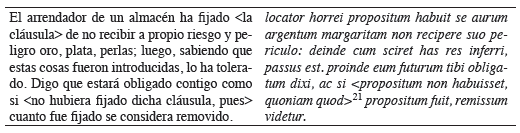 El administrador de los almacenes (locator horrei) había declarado en una cláusula de las condiciones del contrato exhibidas públicamente que él no habría recibido a propio riesgo en el almacén oro, plata y perlas. Sucesivamente, tuvo conocimiento de que estos objetos fueron introducidos, lo había tolerado, y entonces es considerado responsable por su pérdida como si no hubiera exhibido la cláusula de exoneración, pues esta se consideraba revocada. La solución propuesta por el jurista no cambia, aunque no se acepte la integración pensada por Mommsen, dejando el texto de D. 16.2.60.6 en el estado en que llegó a nosotros22.