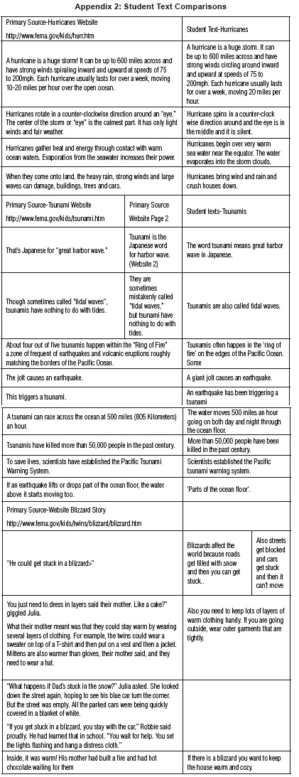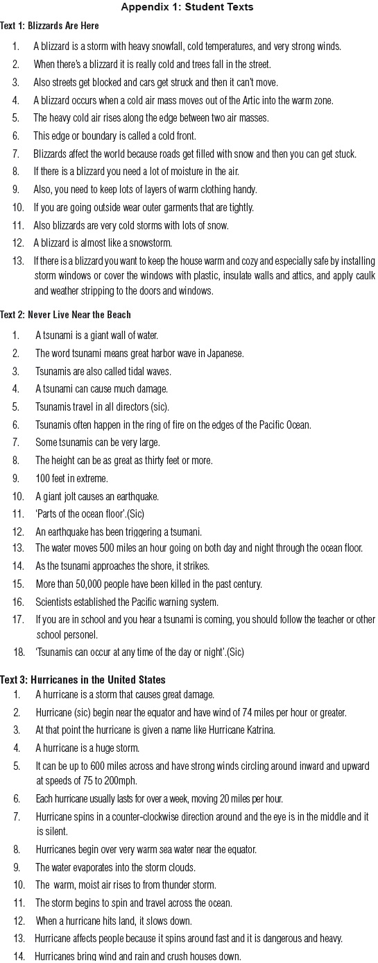 This research stemmed from a larger ethnographic study in which the researchers spent a year observing the literacy practices of this ELL group. For this part of the study, researchers observed ten lessons each lasting approximately two hours in duration. In these observed lessons, students read two books. Marybeth also guided the students to a series of websites related to phenomena of nature and weather which they were to use as resources for their text compositions. One was a sample of realistic fiction depicting characters involved in weather disasters and the other was described as "a non-fiction companion" to this text. Data collection methods included the researchers taking field notes, collecting student's notes and work samples as well as the classroom texts, and downloading the websites students used as reference points for their own research. These websites served as the primary resource for student's literary borrowing and manifest intertextuality that are the focus of this paper. The writing samples which the researchers used for analysis were the product of an assignment in which the teacher asked the students to choose one phenomenon of nature and write an informational report describing it. The students chose blizzards, tornadoes, and tsunamis, respectively.