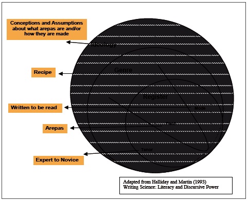 The important point here is that all meaning-making, including linguistic meaning-making, necessarily simultaneously makes these three kinds of meaning. The simultaneous presence of each of these meanings in any text is necessary if anyone is to make sense of each other and the world around them. The diagram below attempts to provide a graphic representation of how SFL conceives language as a semiotic system regulated by ideology, genre, and register features. What may seem to be abstract and somehow complicated is further simplified as the graphic uses a text concerned with a recipe to make arepas. The recipe is followed by the graphic representing it.