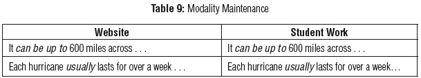 The interpersonal analysis of the texts also focused on modality use. The modality resources of language help writers assess the validity of their text (Thompson, 2004). When students use a high level of modality, adding "may, should, could, can, might" and other modals they adjust the strength of the validity of their claims. using weak modals such as "could" or "might" indicates a weaker claim. In the student texts some instances of modality remained unchanged as students employed manifest intertextuality to appropriate the modality in its exact form. Table 9shows examples of this modality maintenance.