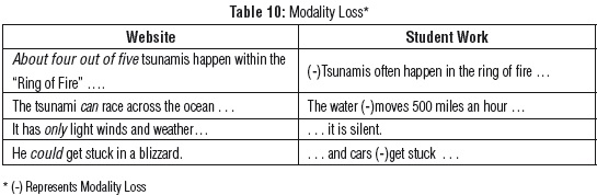 In the first example, the student did not appropriate the modality of frequency "About four out of five" as a modifier of tsunami and chooses to pack this information into the adjunct "often." In the second example, the student eliminates the modal "can" in "can race" and chooses another material process and participant "water moves." In the third example, the modal adjunct "only" is not taken up, and lastly in the fourth example the student does not take up the modality of probability evident in "could get stuck" and instead chooses "cars get stuck."