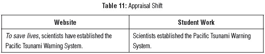 Comparison of these two clauses reveals that the student chose not to maintain appraisal inherent in the clause "To save lives" which expresses a socially sensitive attitude toward the warning system. Her choice to use the word "scientists" without this appraisal marker denotes a more "scientific" and "objective" stance typical of information reports.