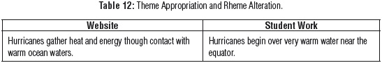 In the first example, the student does not use the reference pronoun "they" as theme, but rather uses the more concrete theme "Hurricanes" in her text. In addition to it being more concrete, the theme "Hurricanes" is also an unmarked one in contrast to the marked theme "When they come onto land" used on the website. This choice is less an indication of the student's lack of control over the use of unmarked themes and more a strategy to make the text her own. Additionally, it indicates the student's ability to conform to target features of the informational report genre. Plenty of evidence that this is the case follows.