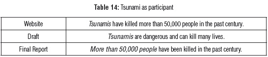 Another instance of theme alteration occurs in the tsunami report. Table 14 below shows the original website report, the student's use of the participant during the intermediary drafting stage, and her final report.