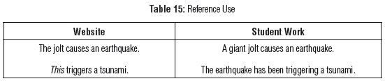 The last part of this section will briefly look at textual cohesion. One of the ways textual cohesion (or lack thereof) is demonstrated is through reference. Reference is an additional element of the textual metafunction which concerns the manner in which the speaker or writer repeats information which is already shared by the participants or whether he introduces something new in the text (Thompson, 2004). Ellipsis and substitution serve as the two main points of reference in a text. An ellipsis occurs when there is an avoidance of repetition of previously known information. Substitution occurs when that information is replaced with a "linguistic token" (Thompson 2004, pg. 180) such as "so" to stand in place of the information. Table 15 compares reference use in the website and the student text.