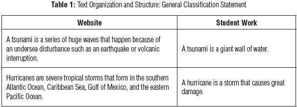 In the first example, the student's text mirrors the target text structure in that it introduces the topic in its classification stage. This is done by using generalized participants, (i.e.) Tsunami and employing the relational process "is" to define this generalized participant. This relational process "is" remains in the timeless present, a typical linguistic feature of the genre.