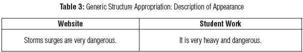 As each of the student's text progressed, the researchers noted that the student texts followed the generic structural form. Students' next paragraphs functioned to describe the appearance of their chosen topic. Table 3 shows how they appropriated this structure to allow the paragraph to function as a description of the topic's appearance.