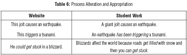 In the first example, the student appropriates the material process "triggers" and alters it to a progressive material process "has been triggering." In the second example, the student appropriates the material process "stuck." This is a particularly interesting sample of intertextuality because the original text represents the narrative genre. The student's text arguably looks more dense and technical despite the fact that the noun "blizzards" in the original text is denominalized into the less packed expression "roads get filled with snow." This example is interesting because it shows how the student perceived that a shift from the narrative characteristics of the passage in the original text to those of an informational report was needed. Such a shift may be an indication that intertextual appropriations across genres are beginning to populate students' texts.