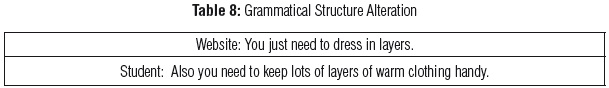 Comparison of the roles reveals that the function of the students' clauses remained "information giving" in their texts. Additionally, most of the intertextual samples maintained their grammatical structure as declarative clauses. The third example (and Table 8) shows some alteration of this grammatical structure, however. Here the student picks up the experiential content of "layers" and appropriates the material process "wear" but deletes the "wh-element" in "What their mother meant was" and instead uses the imperative form "Wear outer garments." Again, this textual analysis of the intertextuality shows how the student alters the grammatical structure as she converts the narrative genre source into one that more closely resembles an informational report.