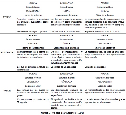 Por su parte, Charles Sanders Peirce, propone un concepto de signo más complejo que el del lingüista ginebrino. Según Peirce, el signo es "Algo que se encuentra para Alguien en lugar de Algo, según cierta Relación o capacidad" (Sexe, 2004, p. 43). De acuerdo con esta definición, el signo puede considerarse un proceso constante en el cual existe una forma perceptual denominada representamen, un aspecto de objeto ya conocido o fundamento y una propuesta de nuevo conocimiento o interpretante. Estas distinciones hacen surgir algunas preguntas de análisis: mediante qué forma, qué existencia captura, interpretada según qué valores. De manera que el concepto de signo de Peirce nos permite captar formas, existencias y valores mediante formas, existencias y valores. Estas relaciones dieron lugar a un sistema diseñado por Magariños de nueve signos aplicables al análisis de avisos publicitarios u otros géneros discursivos y que se explicita en la Figura 1.