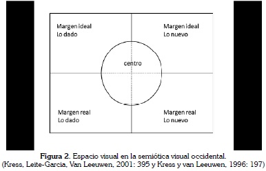 La división horizontal y vertical ya señalada está vinculada al interés del productor del discurso y el tipo de recurso o material que ubica dentro del espacio visual está determinado culturalmente por el interés de quien diseña la estructura (Kress, Leite-Garcia& Van Leeuven, 2001). Resulta interesante destacar que Kress y van Leeuwen (1996) descubren que al dividir el espacio visual de esta forma, nos encontramos con la figura de la Cruz, que constituye un símbolo espacial fundamental en la cultura occidental (p. 207).