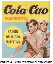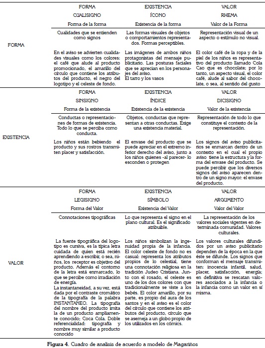 En este apartado se aplicará el cuadro de análisis de Magariños - Peirce que fue descrito y ejemplificado en la sección 2.3 a un aviso publicitario de la bebida Cola-Cao, en Figura 3. En cada casilla del cuadro, que se ilustra en la Figura 4 se completará con el signo correspondiente advertido en el aviso publicitario de manera de ir fragmentando el discurso publicitario y estableciendo relaciones entre los recursos semióticos que lo conforman.