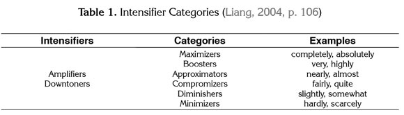 Specifically regarding expressing and modifying degree, Kennedy (2003) carries out a study which characterizes intensifiers in two subgroups: maximizers and boosters. In the group of maximizers, he presents words which convey maximum intensity like obsoletely, completely, entirely, fully, and so on; and boosters meaning less than the maximum intensity but enhance degree nonetheless like, for example, very unclear, really annoyed, and particularly helpful, among others. He also typifies downtoners like rather, a bit, somewhat, and so on. The research describes the frequency in which particular combination patterns appear, describing not only the functions they come to fulfill, but also their positive and negative connotations and the level of strength they denote. Likewise, Liang (2004) reports on the use of intensifiers in the corpus of Chinese EFL learners' spoken English comparing it to the speaking patterns displayed in the corpus of native speakers of English. He concludes that the overuse of some and the underuse of other intensifiers suggest a low understanding of the social behavior of such linguistic items and that learners overused the word very in instances in which maximizers and compromizers were more common in native speakers' speech. To such end, he used the following categorization Table 1: