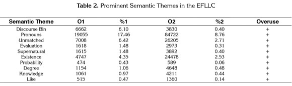 "Studies of EFL learners' use of intensifiers can be of significant value to the understanding of the learners' interlanguage development" (Liang, 2004, p. 106). Being able to express emphasis and magnify degrees and levels of description of the object about which one may be speaking is a sociolinguistic function that takes many forms demanding, at the very least, a vast scope of sociolinguistic assets to successfully assemble comprehensible and culturally appropriate utterances. With that in mind, Table 2 below displays an initial quantitative analysis where the first column outlines word-concentrations of similar meaning grouped in semantic themes. Then, O1 is observed frequency in the (EFLLC): the actual number of times words associated with a particular semantic theme appeared in the learners' corpus. O2 is observed frequency in the American Corpus (2008): the actual number of times words associated with a particular semantic theme appeared in the native speakers' corpus. %1 and %2 values show relative frequencies in both texts: the number of times that words associated with a particular semantic theme appeared in each corpus divided by the total amount of words of their corresponding corpus. Finally the + sign indicates their overuse in O1 relative to O2 (Rayson, 2009).