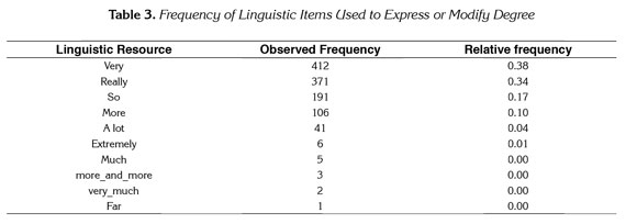 In the case of our EFL learners, the functions to convey degree were predominantly attained to understandable and elementary extents mainly through the use of the words 'very' and 'really,' as shown in Table 3 below, e.g. 'is very important, is very expensive, is very difficult, they really appreciate, is really stupid, they put me really upset' (EFLLC), failing to provide denotative specificities about levels and degrees as well as failing to incorporate socially established conventions and thus falling short of accurately depicting particular accounts. Less frequently, the learners ventured out to employ other resources as in the transcription below; for example, where the EFL learner uses 'so' to magnify the impact of the adjective 'ridiculous.'
