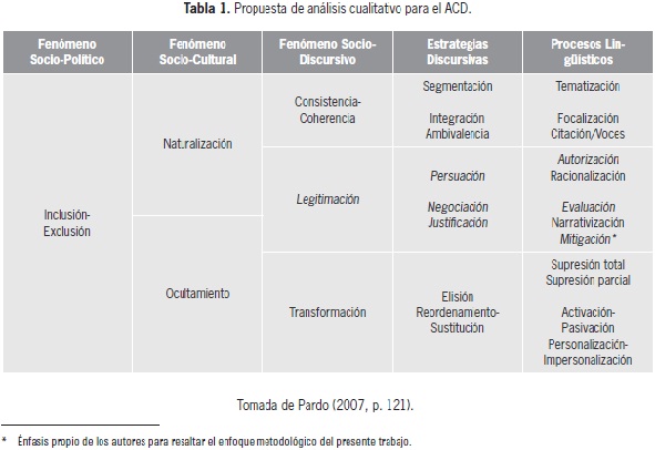 Una vez comprendido el papel de los medios en la estructuración de la opinión pública, el ACD se constituye en una alternativa para analizar la configuración de las dinámicas de control social en los discursos mediáticos. En este sentido, Pardo (2007, p. 121) propone dos niveles de análisis. El primero está relacionado con un análisis textual que permite llegar a conclusiones en cuanto a la frecuencia en el uso de ciertas palabras, frases, expresiones etc., y la manera como éstas se correlacionan, generando la consolidación de unidades de significado en torno a un elemento del discurso. El segundo es un análisis de tipo cualitativo que estudia el discurso desde el nivel sintáctico, pasando por las estrategias discursivas y llegando a un nivel pragmático en donde se encuentran los fenómenos sociodiscursivos, socioculturales y sociopolíticos. En la Tabla 1 se presenta el mencionado análisis.