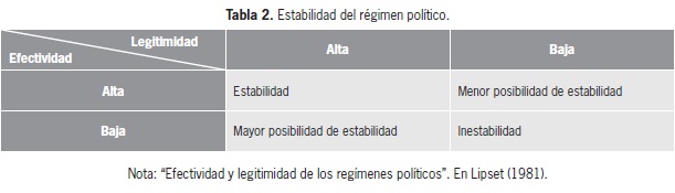 En cuanto a la legitimidad del régimen político, se entiende como la convicción por parte de los ciudadanos de que la ideología imperante es la más adecuada. Tiene que ver con la manera como los ciudadanos no solo aceptan esta ideología sino que la hacen parte de su sistema de valores. La incorporación de estos valores se constituye en un proceso de control social el cual se lleva a cabo, en ocasiones, a través de las prácticas discursivas. Este proceso de legitimación de un régimen político dominante es fundamental en la estabilidad de los gobiernos. Lipset (1981, p. 106) habla de la manera como la efectividad y la legitimidad se relacionan para ser los bastiones de un régimen. Los gobiernos cuya legitimidad y efectividad se encuentran en un punto alto son altamente estables. De manera opuesta, aquellos con baja efectividad y legitimidad son naturalmente inestables. Empero, al observar combinaciones distintas en donde la legitimidad del gobierno es mayor que su efectividad, la estabilidad de este es mayor que la de aquellos gobiernos cuya efectividad es más alta que su legitimidad. En la Tabla 2 se refleja la relación entre efectividad y legitimidad y sus efectos en la estabilidad del régimen político.