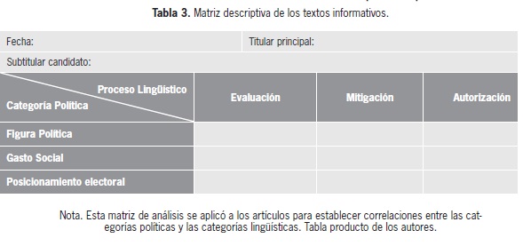 Para este estudio se ha analizado el fenómeno sociodiscursivo de legitimación a través de tres procesos lingüísticos: autorización, mitigación y evaluación (Pardo, 2007, p. 121). En primer lugar, se rastrean los procesos lingüísticos en el corpus y se determina su concurrencia con las categorías políticas planteadas así como con los candidatos en cuestión. En segundo lugar, se desarrolla una matriz descriptiva (ver Tabla 3) que permite visualizar estas concurrencias en el caso de cada candidato. En tercer lugar, se realiza un análisis comparativo de la representación mediática de los dos candidatos. Se pretende establecer en qué medida las diferencias o similitudes se manifiestan en relación con las categorías políticas. En cuarto lugar, se plantea la manera como se configura la exaltación y/o ocultamiento de la figura y campaña política de cada uno de los aspirantes a la presidencia. Finalmente, se presentan conclusiones con respecto a si se favoreció la legitimidad de alguna de las campañas políticas.