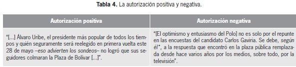 En el primer ejemplo, el diario recurre a un actor discursivo externo (los sondeos) para darle un velo de autoridad a la afirmación que hace (seguramente será reelegido en primera vuelta). Este es un caso de autorización que pretende legitimar lo afirmado por el medio acerca de Álvaro Uribe o, como se ha denominado, un caso de autorización positiva. De manera opuesta, en la segunda cita el diario recurre a una voz discursiva externa fácilmente interpretada como carente de objetividad, lo cual resta validez a lo que se informa (la respuesta que encontró en la plaza pública). Este es un caso de autorización negativa.