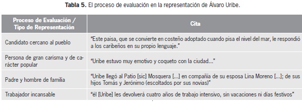 El proceso de evaluación se hizo presente en la representación de la figura carismática de Uribe mediante el uso de frases adjetivas y verbales de carga semántica positiva. Uribe fue constantemente representado como una figura asociada con valores patrióticos y culturales. A continuación, presentamos las principales instancias en las cuales el diario recurre a este proceso. (Tabla 5).