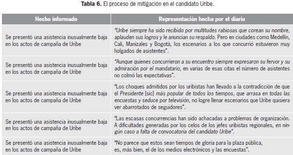 Adicionalmente, el diario recurrió al proceso de mitigación para informar aspectos de la campaña que eran claramente desfavorables para el candidato Uribe. En la Tabla 6 podemos evidenciar esto de manera más clara.