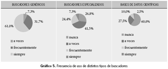 Al ahondar en los comportamientos de los estudiantes en el caso del uso de Internet como herramienta de búsqueda de información, hallamos un dato que consideramos muy significativo. Como se observa en el gráfico 5, la mayoría de los encuestados (61 %) dice emplear siempre buscadores genéricos. Si a ello se suma la cifra de los que dicen hacerlo frecuentemente, que es el 31,7 %, llegamos hasta el 92,7 % de la población encuestada que muestra ese hábito de búsqueda. El uso regular de buscadores especializados según la temática del estudio que tenga que realizarse o de bases de datos científicas queda relegado al 31,7 % y al 12,5 %, respectivamente, si incluimos los estudiantes que dicen usarlos siempre y frecuentemente. Un 60 % de los estudiantes dice que nunca emplea bases de datos científicas.