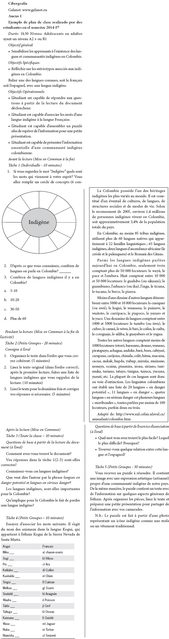 Miremos ahora algunos logros en el ámbito académico. En la más reciente versión del curso, el trabajo final consistía en preparar una clase de inglés o francés en la cual los estudiantes debían integrar algunos de los elementos aprendidos durante el curso. Los trabajos de los estudiantes reflejaron en su mayoría una amplia apropiación de los conceptos y su integración en la preparación de clases. En el anexo 1, dos futuros docentes proponen una clase de francés en la cual los estudiantes descubren algunas características de los pueblos indígenas del país por medio de actividades inspiradas en los enfoques intercultural y de despertar a las lenguas.