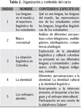 Es importante mencionar que si bien se crearon unas unidades de trabajo y se escogieron unos contenidos precisos en el 2011, estos se han ido ajustando a los intereses y necesidades de los nuevos grupos de estudiantes. La organización del curso se presenta en la tabla 2.