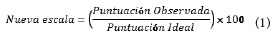 La producción escrita multimodal realizada por cada estudiante con base en la situación de escritura propuesta es valorada por dos evaluadoras externas y la docente-investigadora, utilizando la escala diseñada para tal fin. Cada indicador dentro del instrumento fue valorado en escala dicotómica, 1 si se presenta en el texto la acción que se describe en cada indicador, 0 si no se presenta en el texto la acción que se describe. Posteriormente, se construye una nueva variable que permita realizar comparaciones puesto que la cantidad de indicadores no es la misma en todas las habilidades y esto puede influir en el resultado si se usa la suma como estimación de la prevalencia del indicador. La nueva escala procura llevar las puntuaciones a una escala de 0 a 100, de modo que las comparaciones sean posibles, utilizando la fórmula (1):