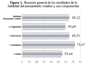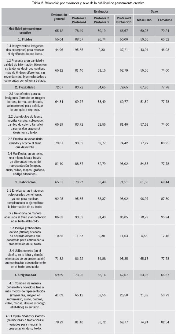 En la tabla 2 se presentan los resultados de las valoraciones realizadas, incluyendo la variable sexo. Si bien los datos muestran una marcada tendencia positiva de las niñas hacia los procesos creativos (70,4), siendo el aspecto más diferenciador la flexibilidad (77,8) y la originalidad = 67,7), lo relevante de los resultados es la evidencia de la asociación existente entre las dos variables en los procesos de enseñanza y aprendizaje, independientemente del género.