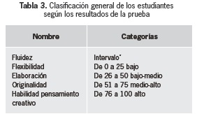 Ahora bien, se utilizó la información obtenida a partir de los cuartiles de la variable para generar una clasificación general de los estudiantes, según los resultados en la prueba, tal como se presenta en la tabla 3. Más que medir el rango, se trata de identificar grupos que muestren las posibilidades de potenciar dichas habilidades con propuestas intencionadas en la escuela.