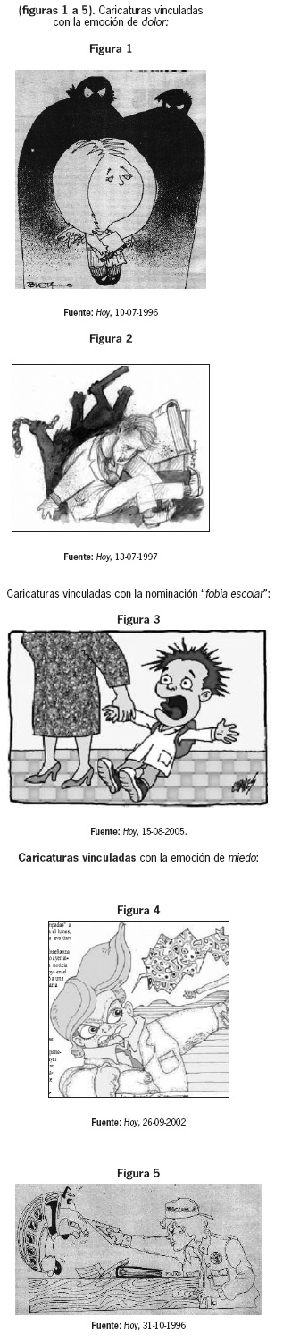 Es necesario destacar que en las coberturas del diario Hoy se presentan caricaturas donde se visibilizan las emociones de dolor y temor. Como sostiene Simmel (2011), las caricaturas son un recurso comunicativo eficaz, "como una lente de aumento que hace visible lo que, sin esa ayuda, el ojo no sabría ver" (p. 46). En ellas se resaltan los gestos culturalmente moldeados de tristeza en el caso de la representación del dolor y de la furia que causa miedo.
