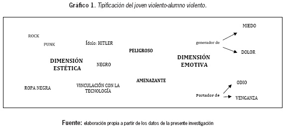 La prensa platense reproduce y transmite las violencias en el espacio escolar, y de esta manera perpetua estereotipos y prejuicios. Las formas de clasificación, apreciación y evaluación presentadas en los nombramientos contribuyen sistemáticamente a ofrecer una imagen sesgada que favorece la polarización, profunda e ideológicamente edificada, entre un "nosotros" y un "ellos". Observemos en el siguiente diagrama cómo se construyó la tipificación del joven violento-alumno violento: