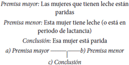 A partir de este esquema, se consolida cada elemento que conforma la tesis, representada en la premisa mayor; las evidencias, que sustentan la tesis a partir de hechos factuales; el ejemplo, o lo que se entiende como razonamiento inductivo, identificable en la premisa menor; y, por último, la conclusión que surge de la relación lógica entre ambas premisas, como se muestra en el ejemplo de las mujeres.