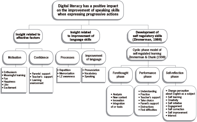 As shown in Figure 2, the categories can be described as follows: A core category emerged known as "digital literacy," which has positive effect on the improvement of speaking skills when expressing progressive actions and which branches out in three categories: