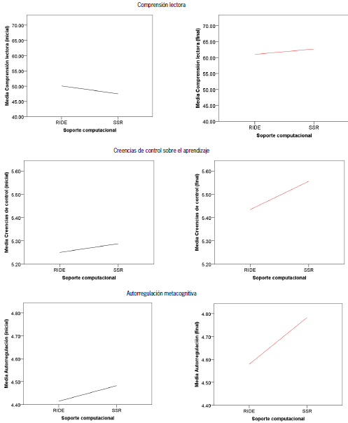 Aunque el Mancova no arrojó diferencias significativas entre los modelos de regulación social ni entre los métodos de conformación grupal involucrados en el estudio, se examinaron los estadísticos descriptivos y las medias marginales estimadas para identificar posibles tendencias en la distribución de los datos. Al explorar el soporte computacional para apoyar la regulación social, en relación con las tres variables que mejoraron significativamente luego de la intervención (Figura 5), se encontró que la condición con apoyo para regular actividades asociadas con la tarea (ssr) generó mejores resultados en términos del logro de aprendizaje (M = 63,17, ET = 1,60), las creencias de control sobre el aprendizaje (M = 5,54, ET = 0,08) y la autorregulación metacognitiva (M = 4,79, ET = 0,07).